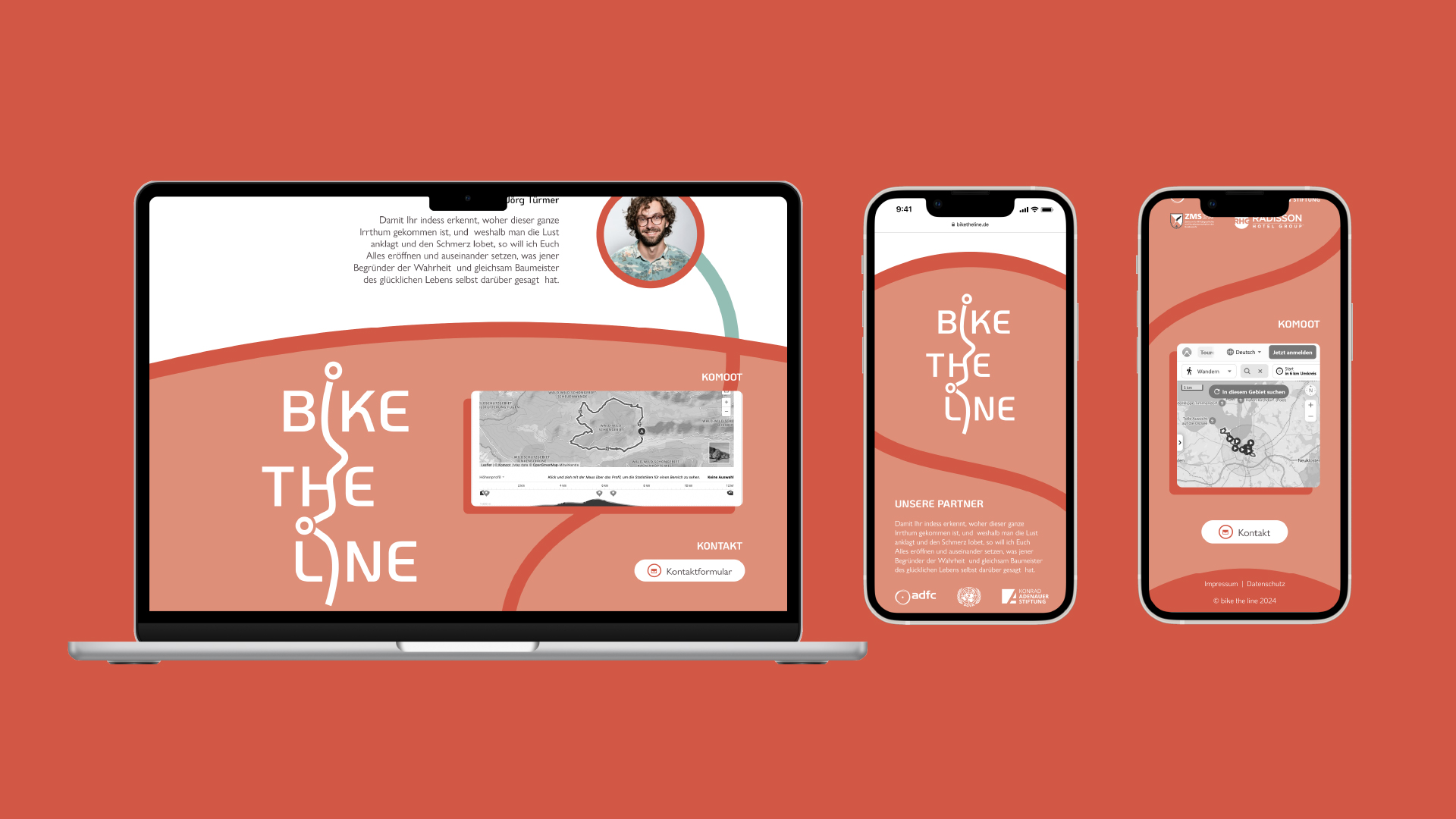 Für „Bike The Line 2025“ wurde ein funktionaler Website-Prototyp in Figma entwickelt, der mobile-first umgesetzt ist und auch für Desktop optimiert wurde. Der Prototyp umfasst die Hauptseiten Homepage, Team, Mission und eine Kontaktseite. Eine zentrale Funktion ist die interaktive Karte, die die gesamte Route, einzelne Etappen, wichtige Orte und Sehenswürdigkeiten visualisiert. Diese Karte wird durch historische Bilder und Infotexte ergänzt, um den Besuchenden ein umfassendes Verständnis der Strecke und der Mission zu vermitteln.