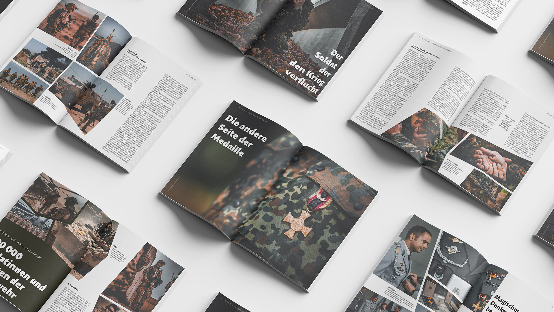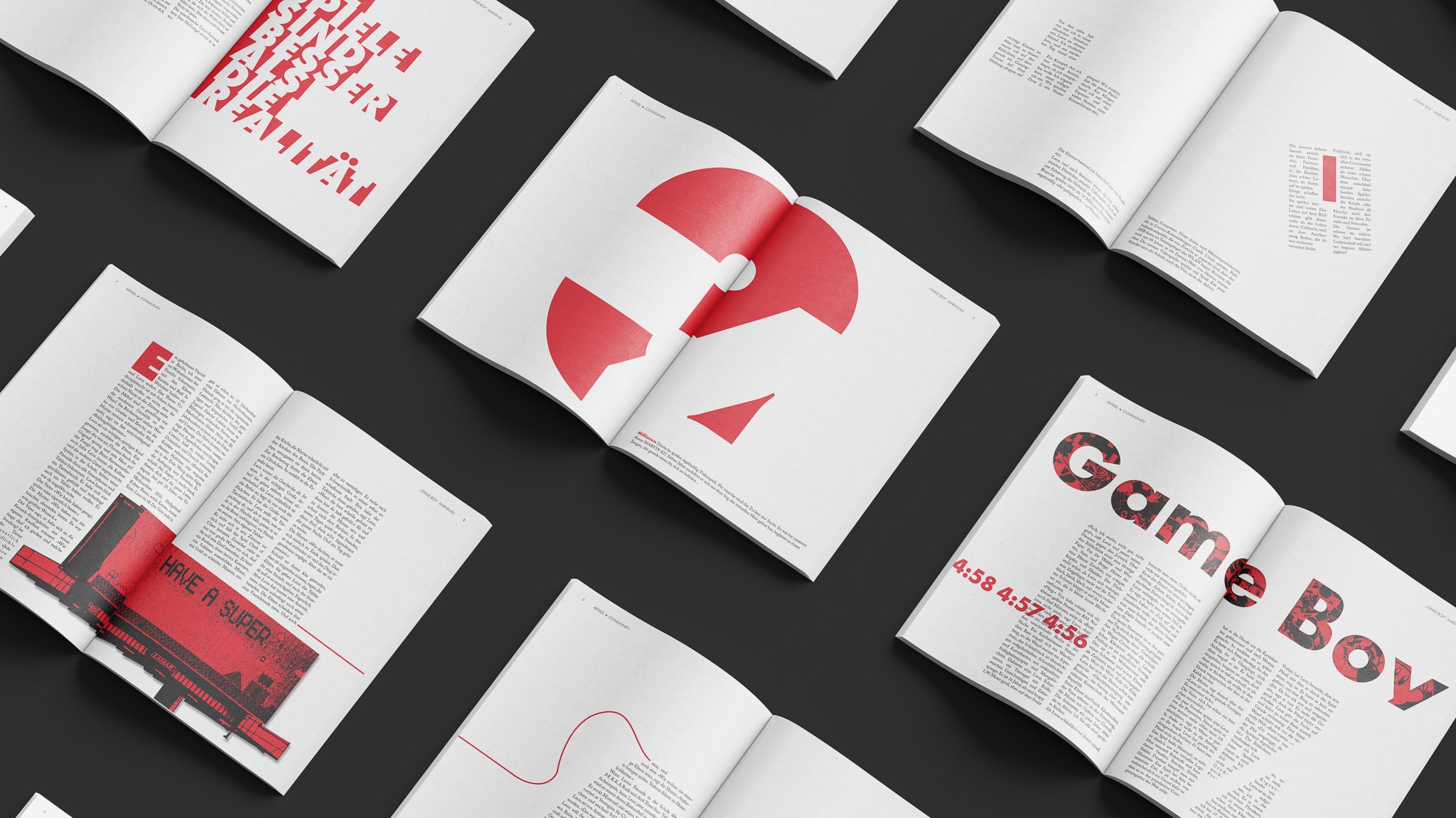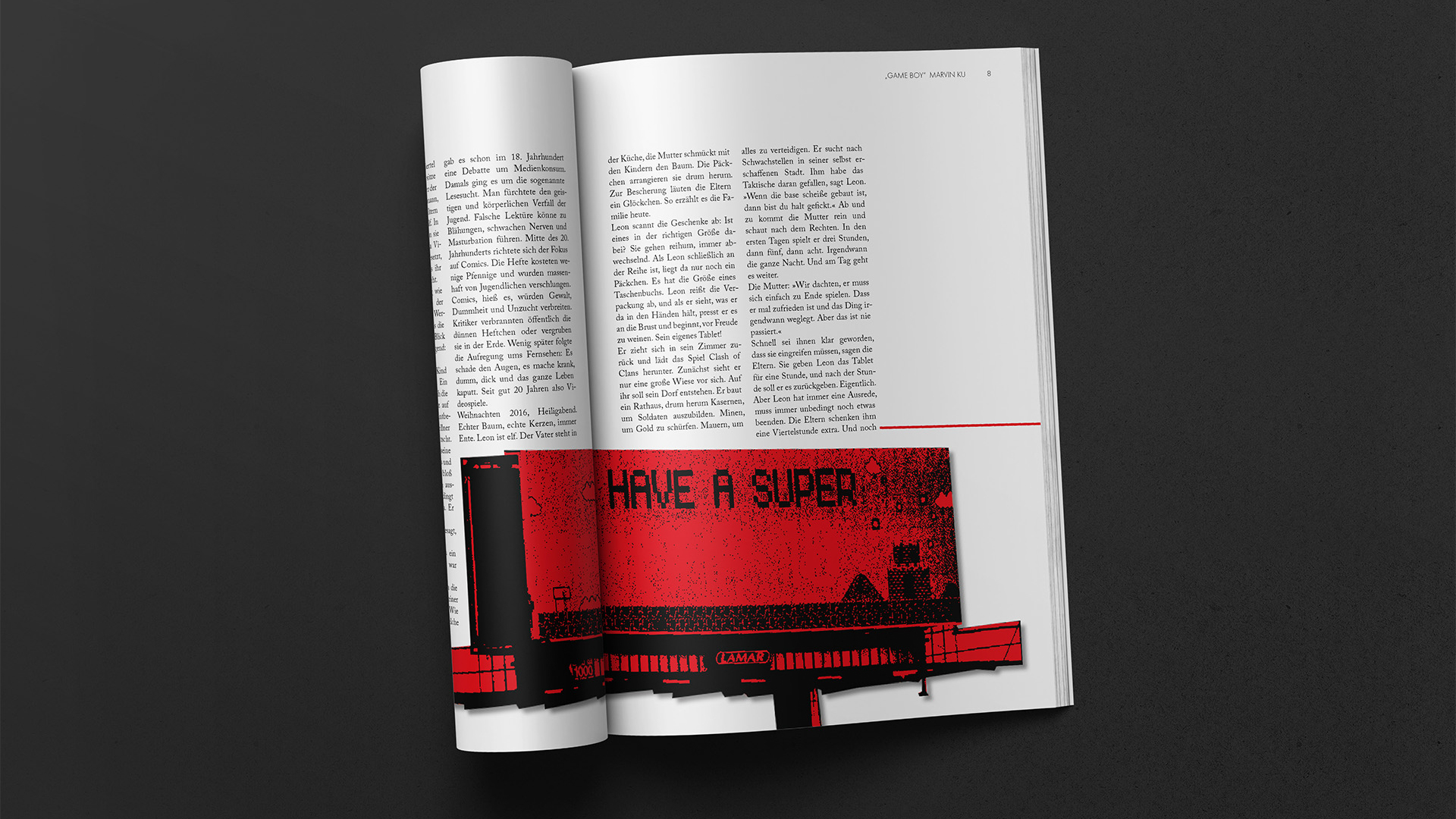 Entstanden sind vier Magazin-Serien mit jeweils sechs Doppelseiten. Dafür wurden die Texte »Game Boy« von Marvin Ku, »Kann man an der Macht ein guter Mensch sein« von Bernd Ulrich sowie zweimal »Die andere Seite der Medaille« von Johannes Böhme ausgewählt. Die Layouts bewegen sich zwischen strengem Raster und freier Komposition und zeigen verschiedene Ansätze im Editorial Design.