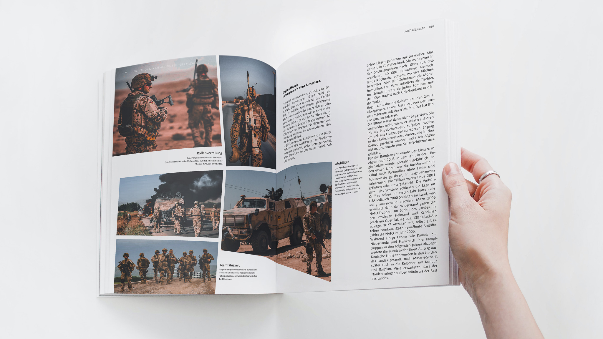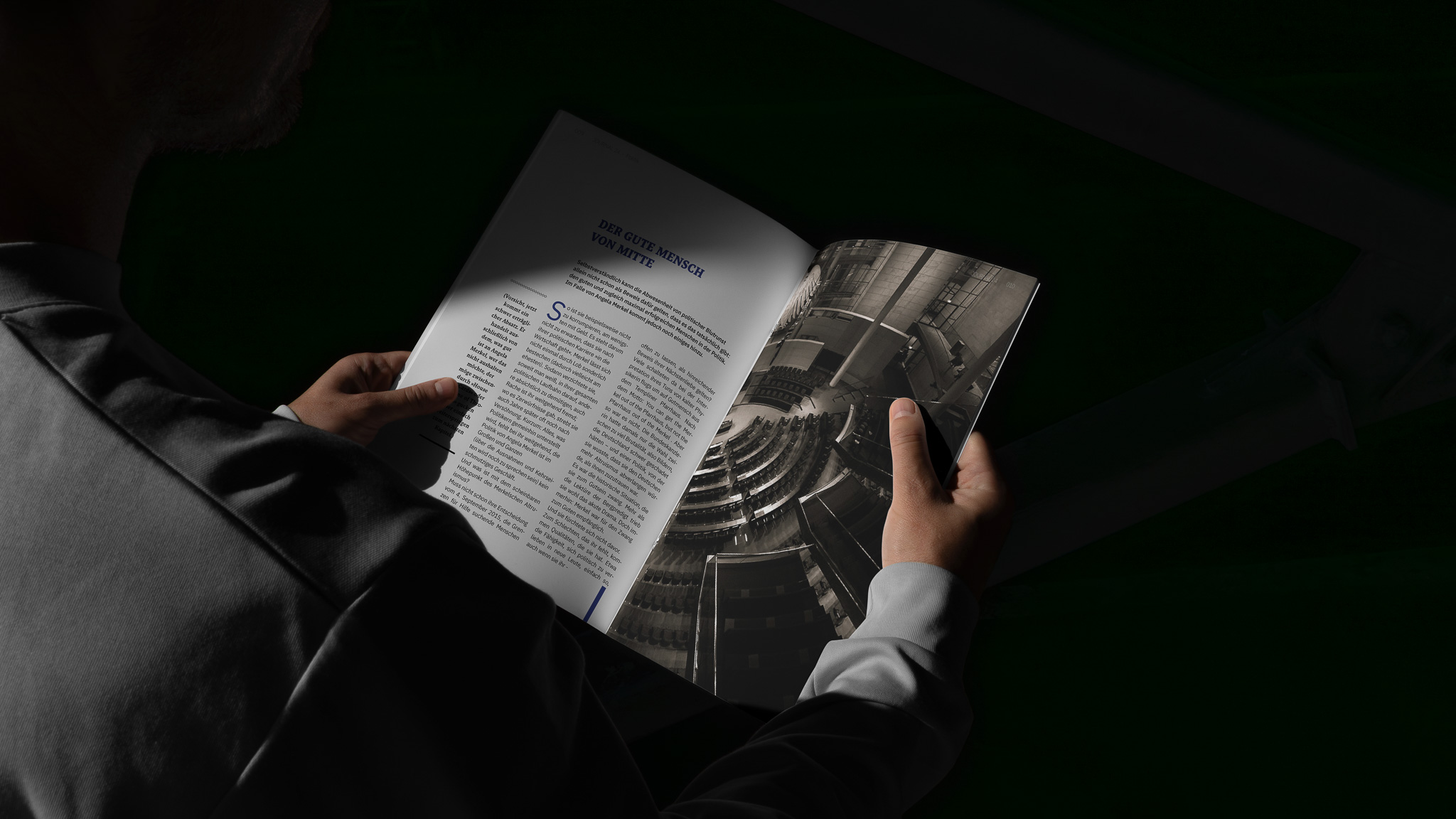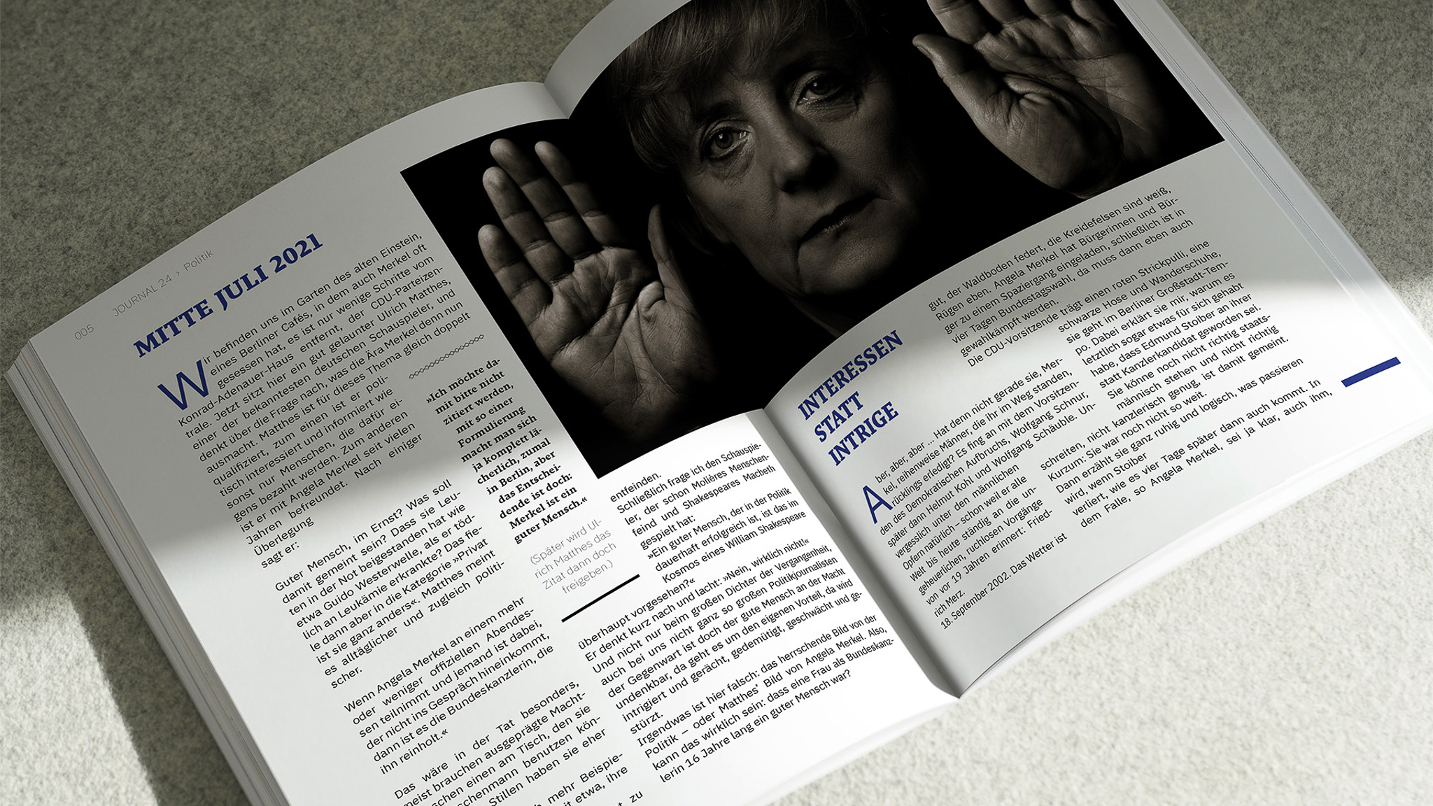 Entstanden sind vier Magazin-Serien mit jeweils sechs Doppelseiten. Dafür wurden die Texte »Game Boy« von Marvin Ku, »Kann man an der Macht ein guter Mensch sein« von Bernd Ulrich sowie zweimal »Die andere Seite der Medaille« von Johannes Böhme ausgewählt. Die Layouts bewegen sich zwischen strengem Raster und freier Komposition und zeigen verschiedene Ansätze im Editorial Design.